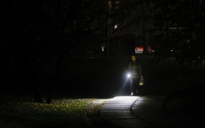 Людина йде з ліхтариком неосвітленою вулицею під час відключення електроенергії в Києві.
